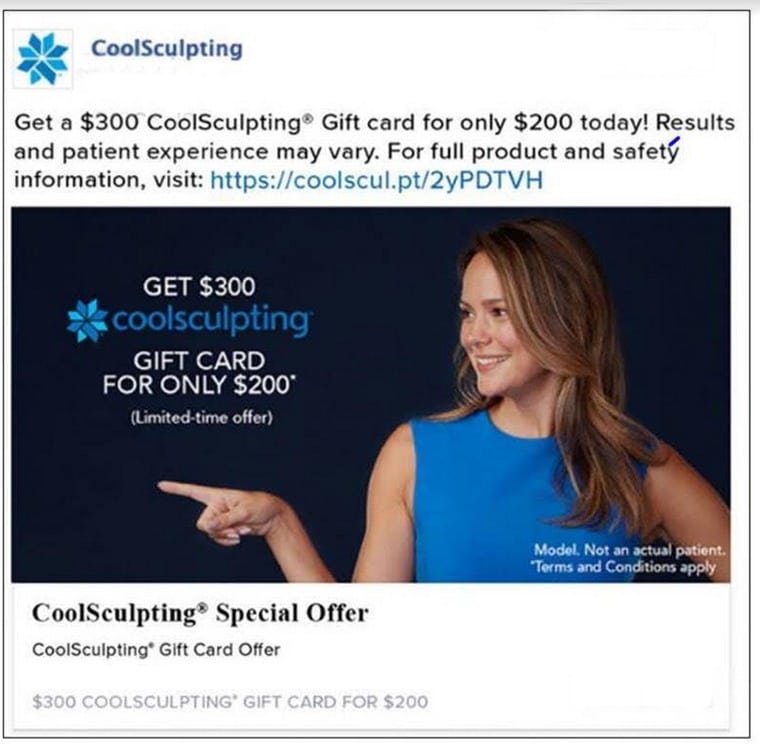 During the month of May, we’re offering $150 off a package of four CoolSculpting® cycles.  Normally $1,875, in May it’s only $1,725.   In addition, Allergan the manufacturer of the CoolSculpting® system is offering a discount on CoolSculpting® gift cards.♦